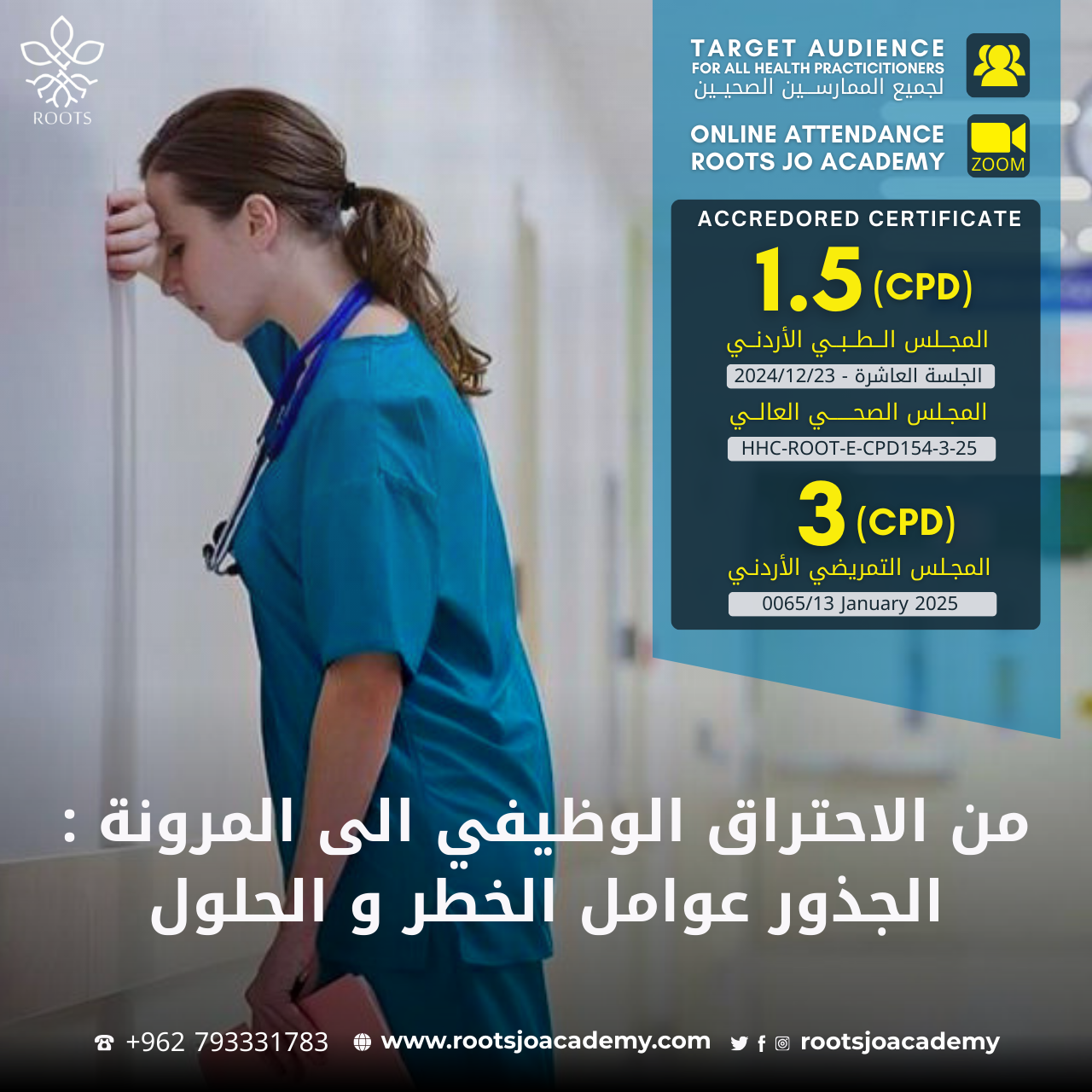 عنوان الدورة:من الإحتراق الوظيفي إلى المرونة في الرعاية الصحية: الجذور، عوامل الخطر والحلولFrom Burnout to Resilience in Healthcare: Roots, Risk Fa...